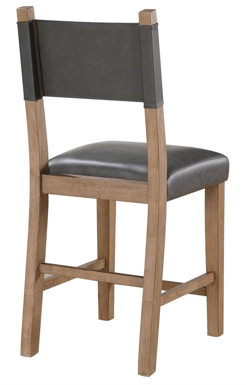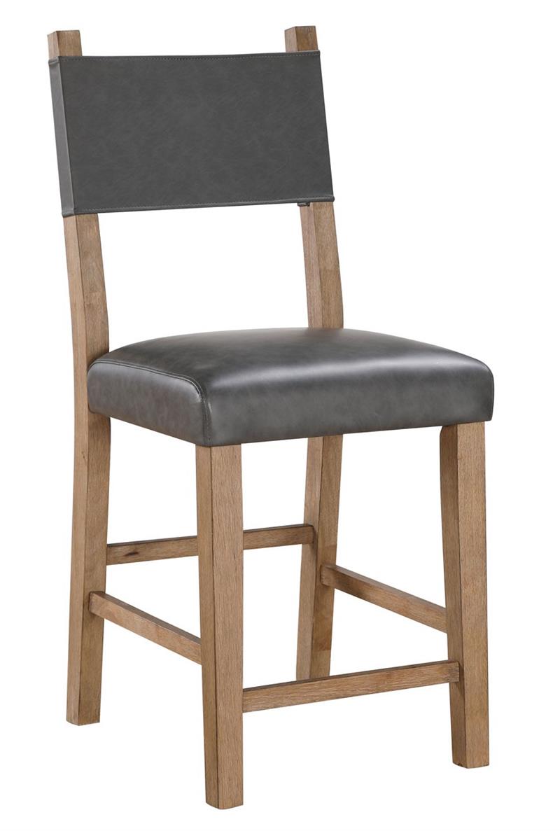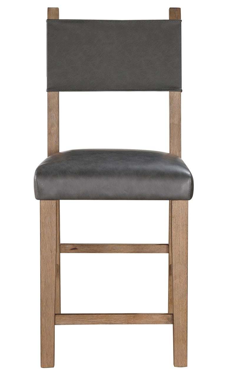 Bring modern lodge charm to your home with the Aubrey Driftwood 5-piece counter dining set by Steve Silver. This stunning set features a 59.5-inch counter table with a robust 1.5-inch tabletop, canted square legs, and eye-catching exposed tenons in a lustrous driftwood finish complemented by black accents. The comfortable gray vegan leather counter chairs, designed for 36-inch counters, feature a 24-inch seat height, solid wood legs, and plush 5-inch cushioning for exceptional comfort. Seating up to six, this compact yet spacious set is ideal for small or medium-sized dining rooms, making for a casual, stylish addition to your home.