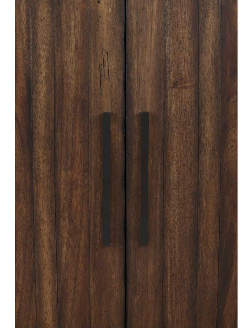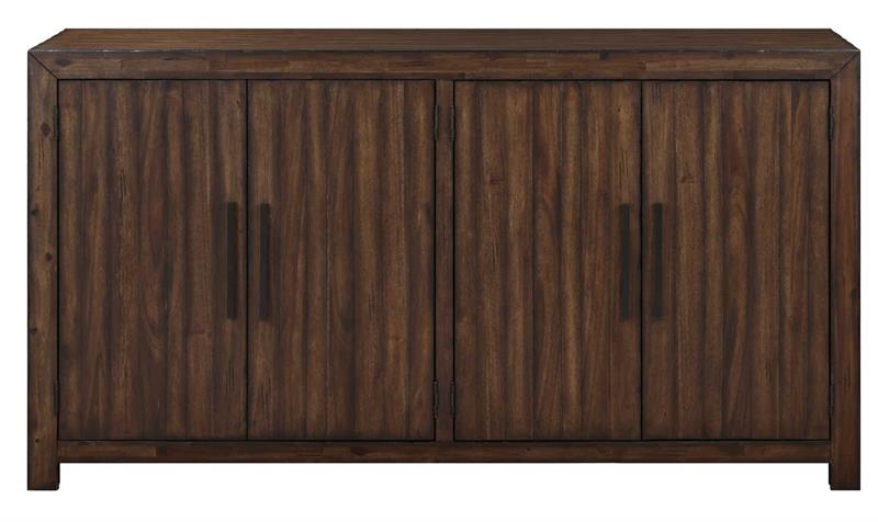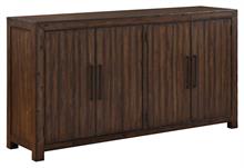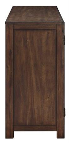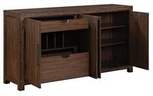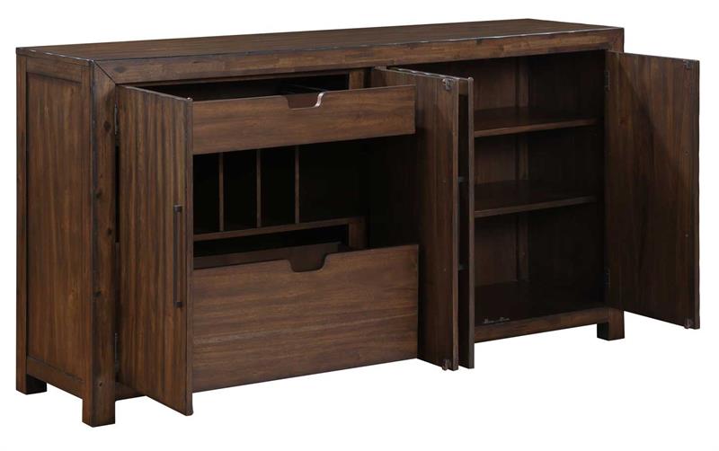 Clean design, rustic charm and exceptional storage combine in the Auburn Server by Steve Silver. Its lustrous dark tobacco finish features burnished highlights and gently rubbed edges creating a casually rustic ambiance. Wood scoring and worn edges add a distressed look, enhancing the charm of the furniture with a vintage-inspired appeal. The wood is hand-stained in a natural multi-step burnished dark tobacco finish to highlight the natural grain and knots of the wood. Black iron hardware offer a beautiful and functional accent. This 71-inch server provides generous storage for all your dining necessities, boasting two felt-lined drawers, three adjustable shelves, and a removable wine rack discreetly tucked behind four magnetic catch doors.