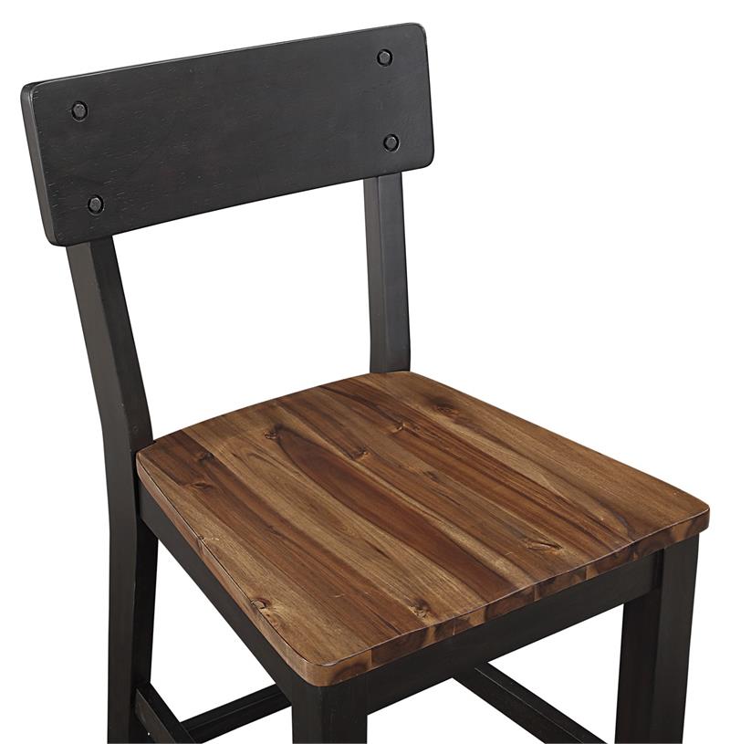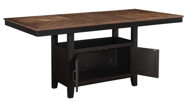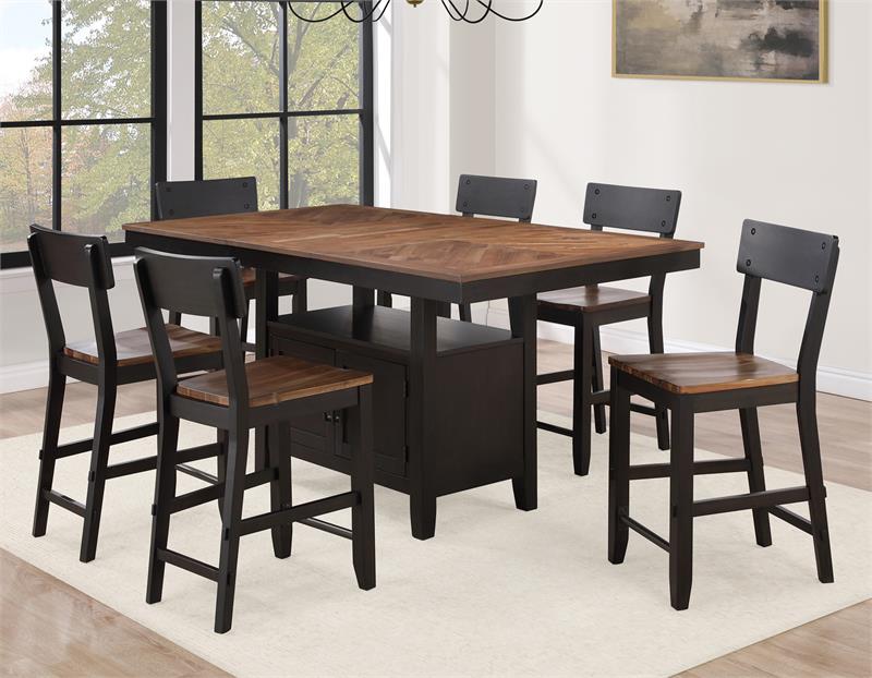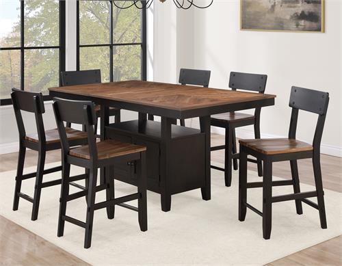 Elevate your dining space with the Bermuda 7-Piece Counter Dining Set by Steve Silver, featuring a table & six counter chairs. Embodying modern farmhouse style with a contemporary twist, this set boasts black and dark acacia finishes over acacia veneers and hardwood solids, exuding both durability and sophistication. The 36-inch high table offers versatility for dining or working, with a convenient 20-inch leaf that seamlessly expands it from a cozy 60-inch setting to a generous 80-inch surface. Tapered legs provide stability and elegance, while the spacious base offers ample storage with dual doors on each side for easy access to essentials. Crafted for both style and functionality, this Bermuda dining set creates a captivating focal point for your space, inviting gatherings and enhancing everyday dining experiences.