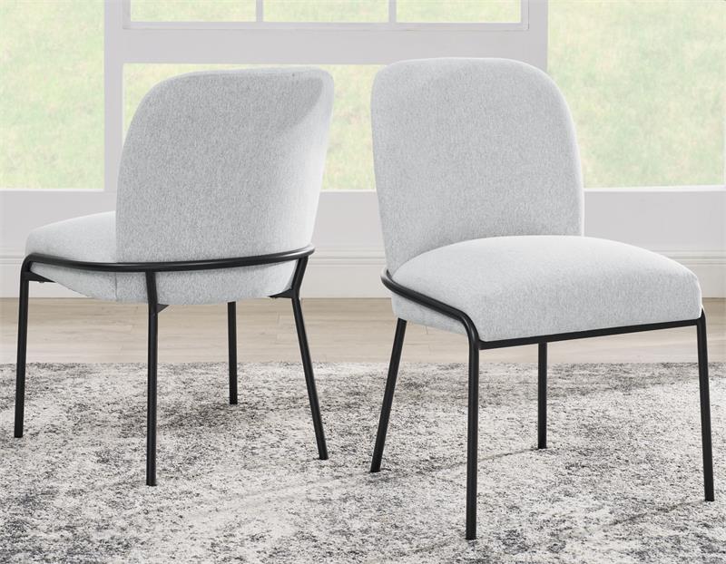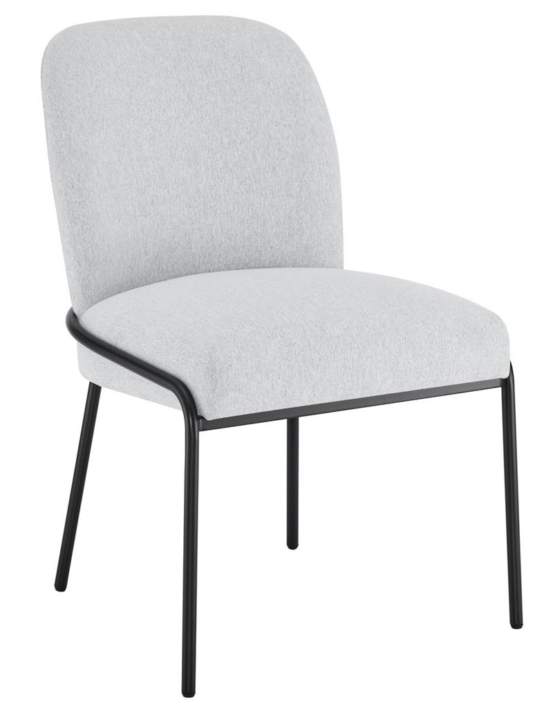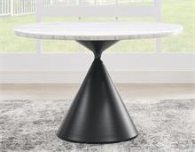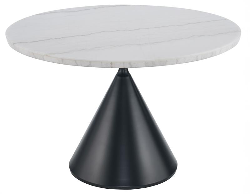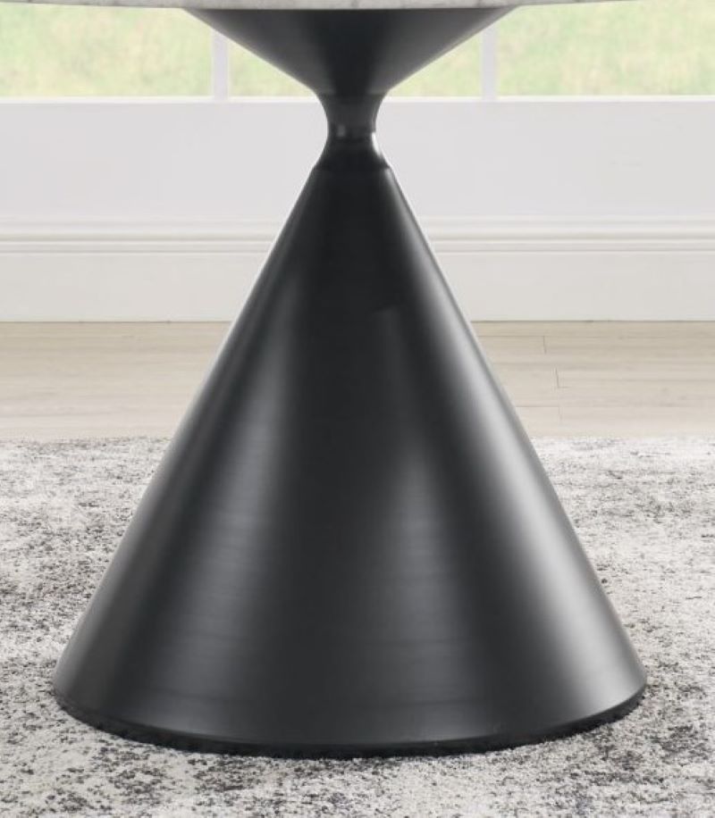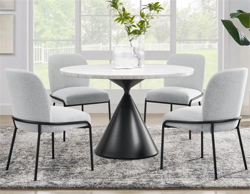 The Conrad 48″ round white marble top 5-piece dining set by Steve Silver, combines modern elegance and functionality. The table features a 1.5-inch marble veneer top with a black conical base, blending sleek sophistication with bold design. The black base combines bold design with practicality. Crafted from durable iron with an electrostatic coated finish, it offers sleek corrosion resistance and lasting durability. Its striking shape enhances modern aesthetics. This table comfortably seats four, perfect for intimate gatherings or everyday dining. Paired with four Conrad black leg cushioned side chairs, each offering a shaped back, easy-to-clean polyester cover, and a black-finished stainless steel base, this set adds contemporary flair and lasting comfort, making it an ideal addition to any dining room.