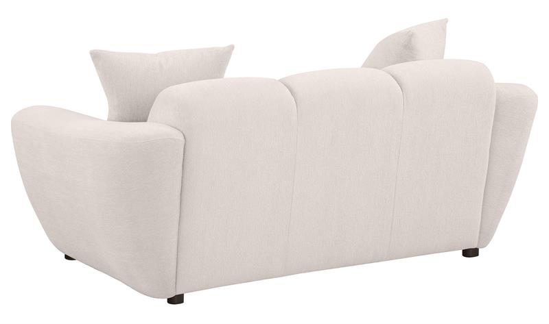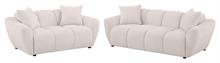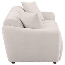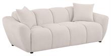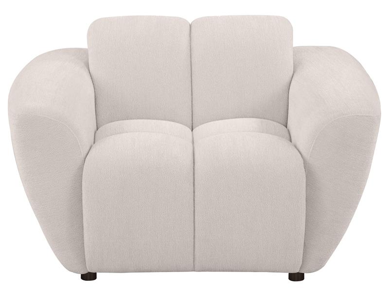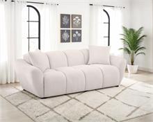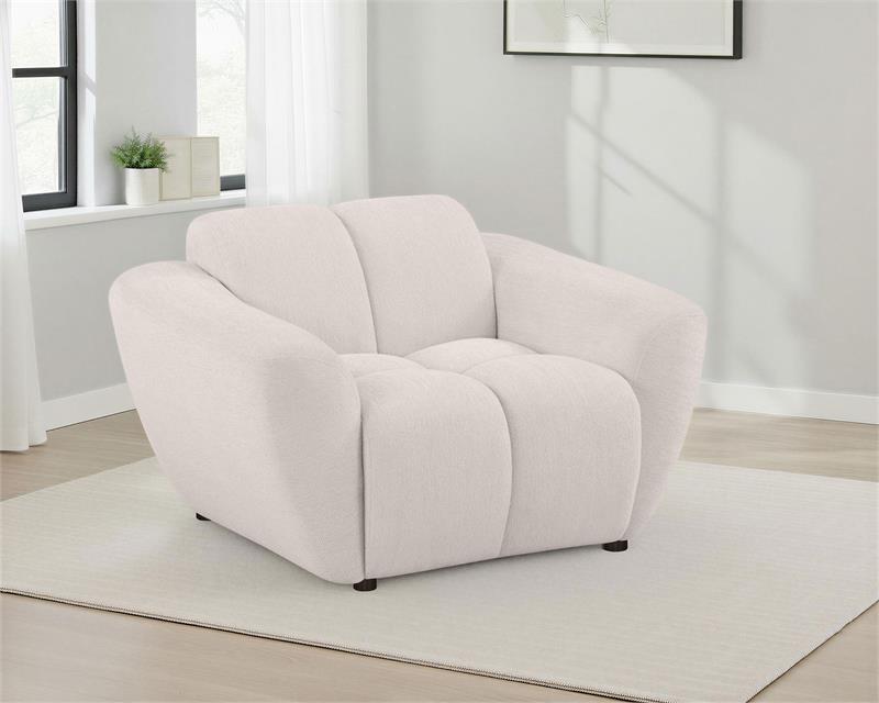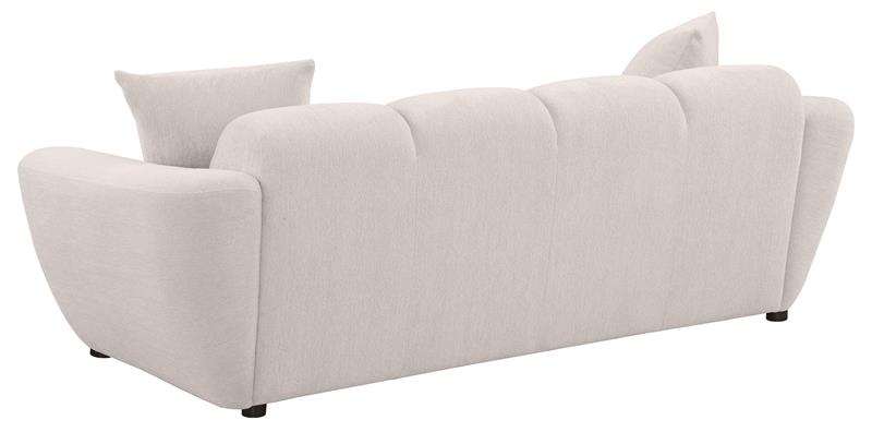 Plush, sculptural, and undeniably bold, the Destino modern sofa set by Coaster, showcases chunky silhouettes wrapped in soft greige chenille. Wide splayed arms frame deep, channel-tufted contours, while attached waterfall seats are built with pocket coil construction for long-lasting support. Textured upholstery adds dimension to the grid-like shaping, offering a refined yet cozy aesthetic. Complete with matching knife-edge accent pillows, this sofa set blends form and function with contemporary ease.