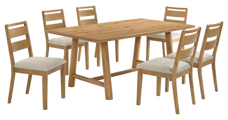 trestle base with rounded posts for timeless appeal. Ladder back chairs