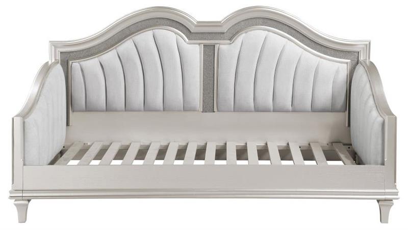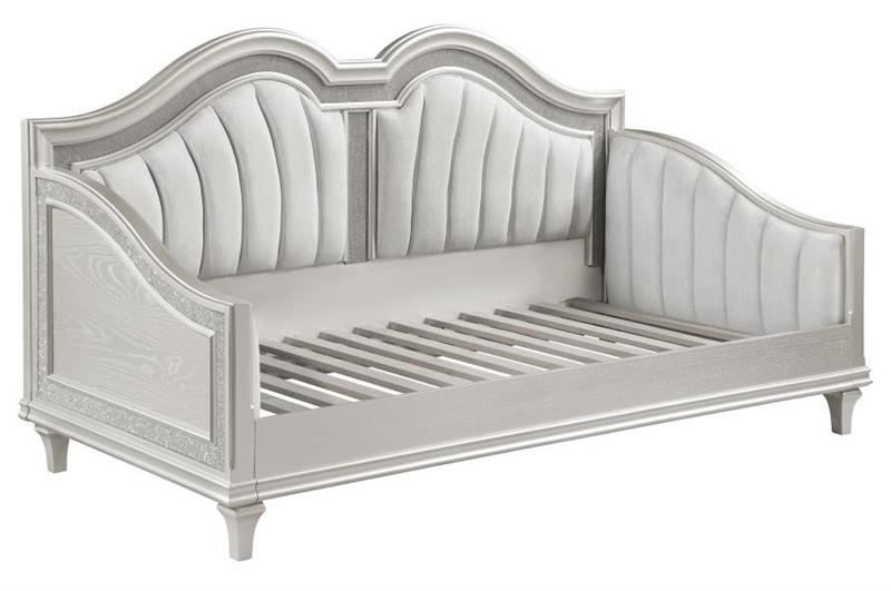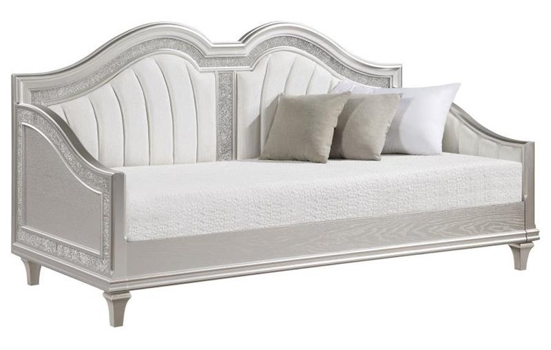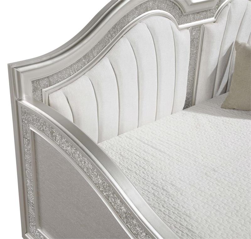 This luxurious daybed from the Evangeline collection by Coaster, is perfect for accommodating overnight guests or creating functional small spaces. Its eye-catching and versatile design, with a curved silhouette and faux diamond trim, adds a touch of elegance to any room.