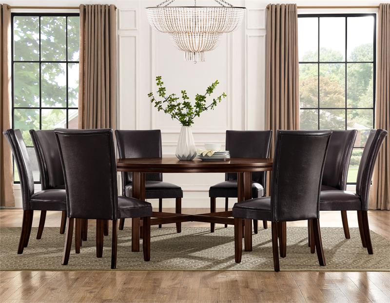 The Steve Silver Hartford round dining table is the essence of comfortable contemporary style, designed to bring out the best in dining spaces of all sizes. Made of hardwood solids and oak veneers with a dark oak wood finish, the Harris 72” round dining table has a unique double top design with fancy face oak veneer and seating for up to eight. Parsons chairs are available in brown or red polyurethane with a comfy 1" memory foam seat padding.