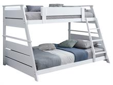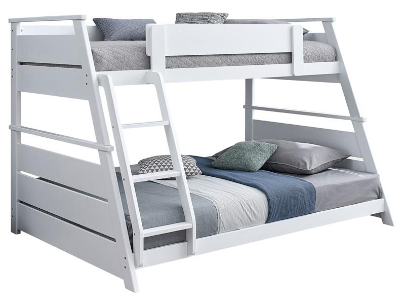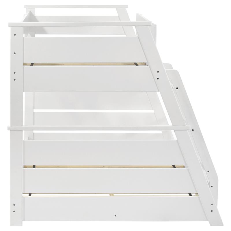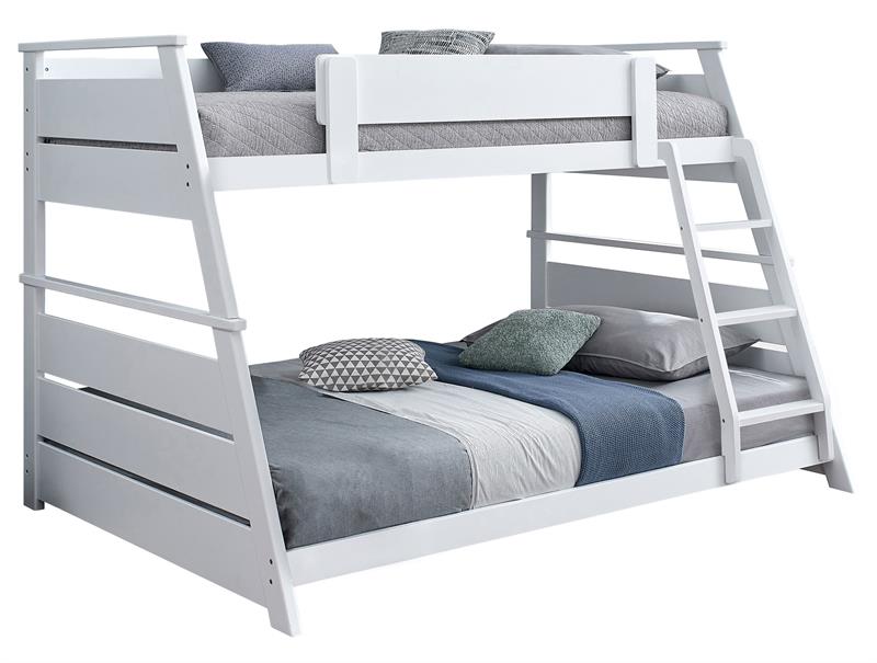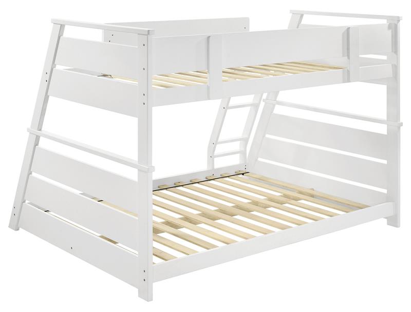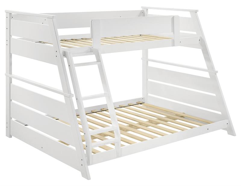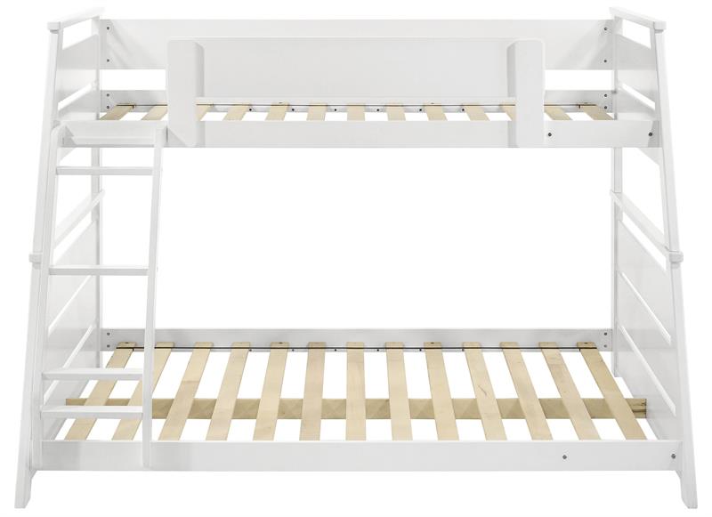 Elevate any teen’s room with the Holden versatile twin-over-full bunk bed by Coaster, blending functionality and style. Crafted from solid rubberwood, and engineered wood, its sturdy frame is designed for durability and timeless appeal. Designed with safety in mind, the upper bunk features a partial guardrail, while the reversible angled ladder offers easy access. A complete slat kit is included, making the bed mattress-ready without the need for a box spring, combining convenience with practical design.