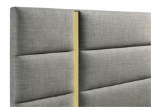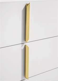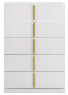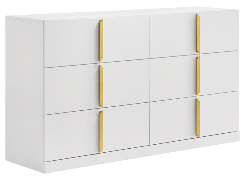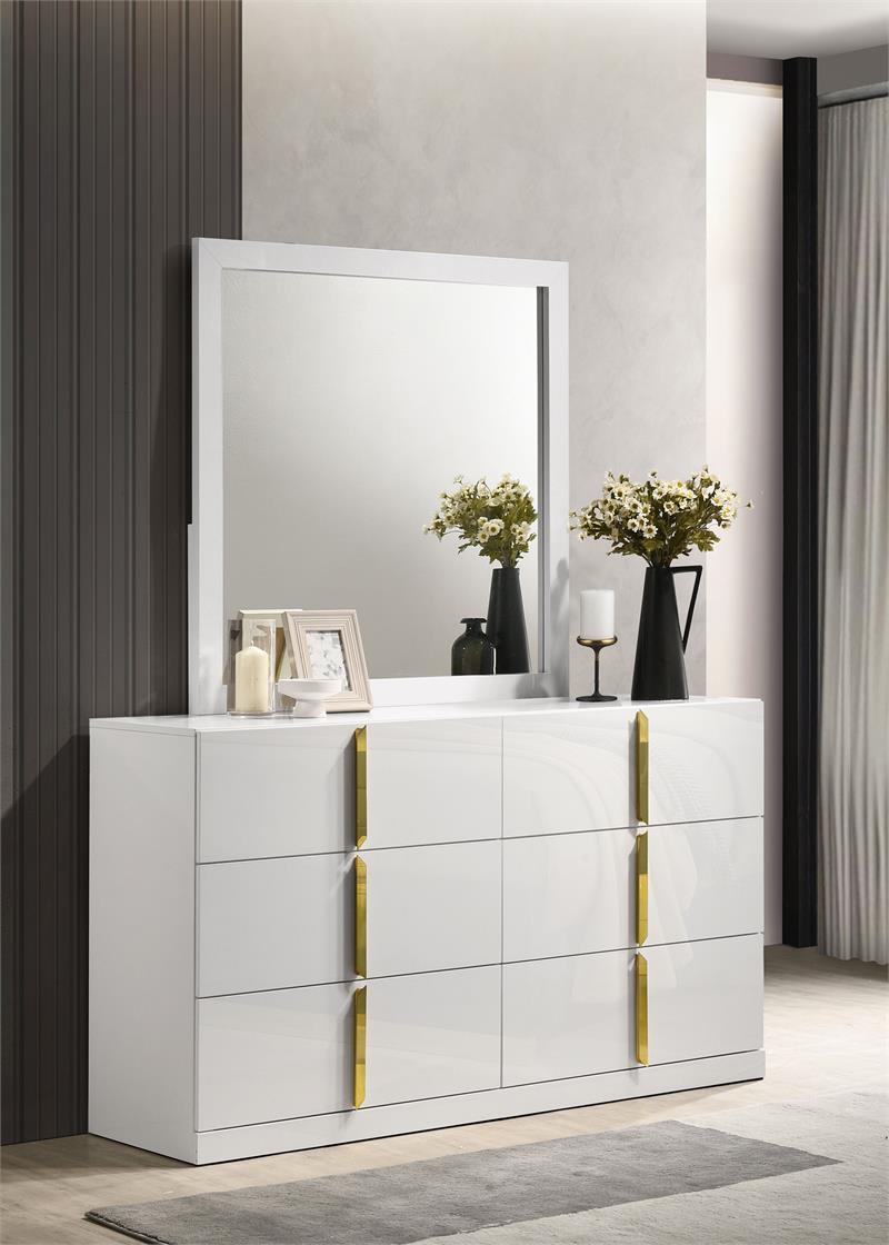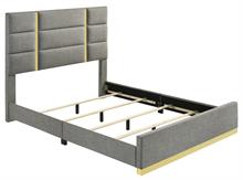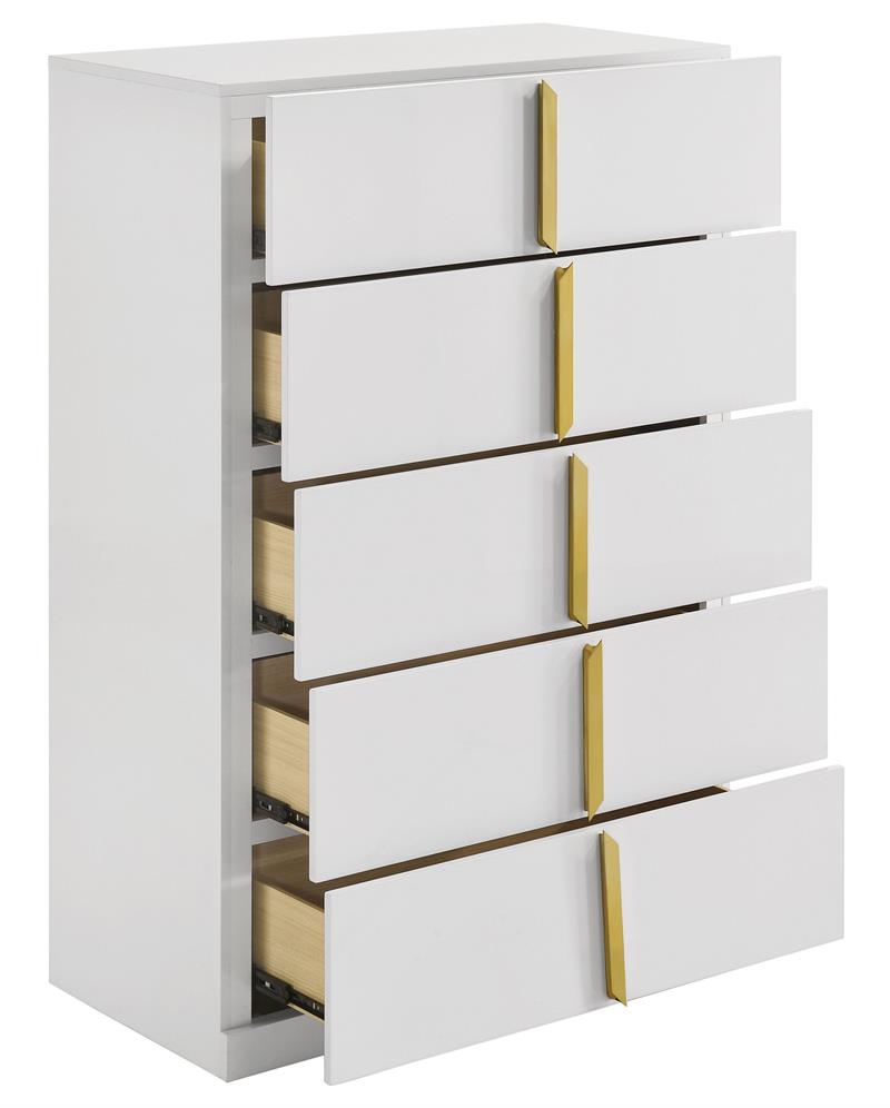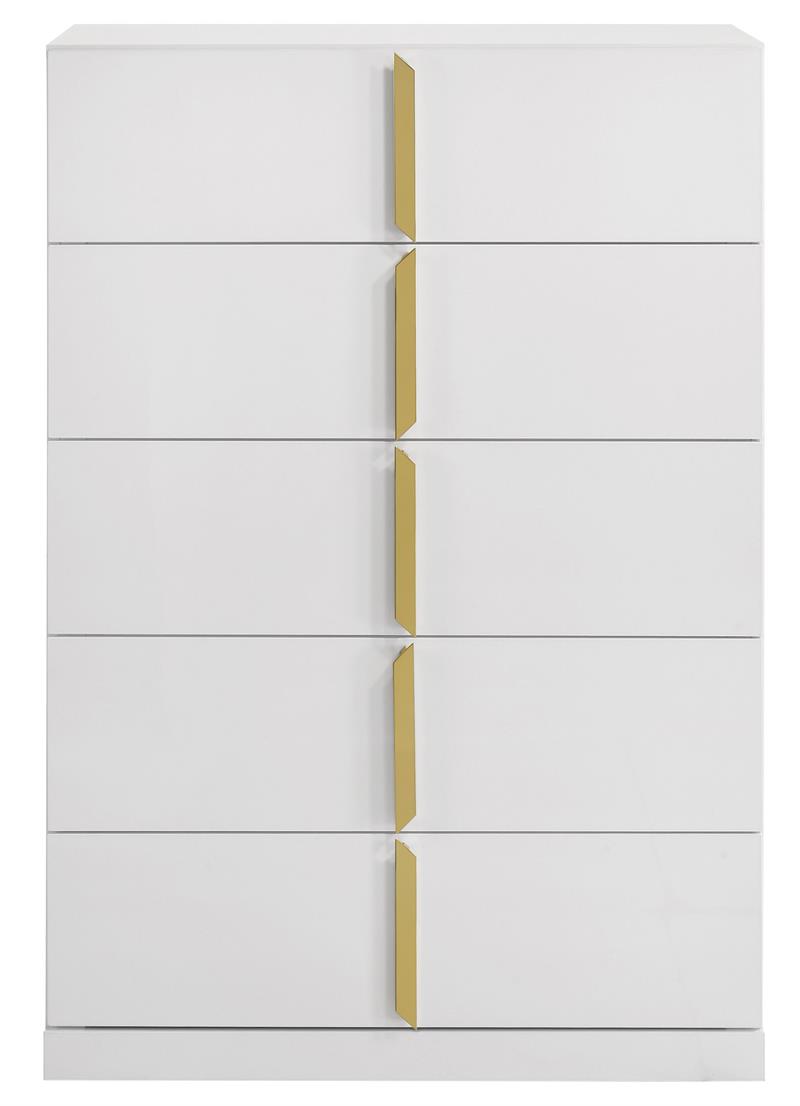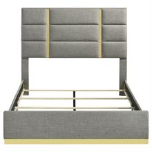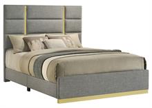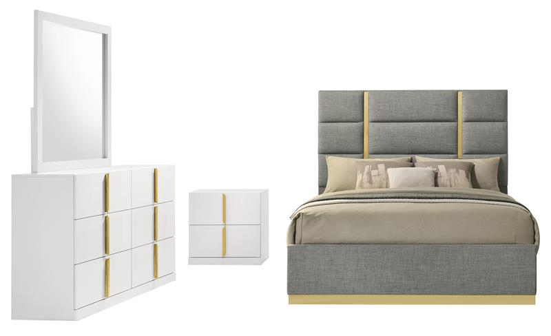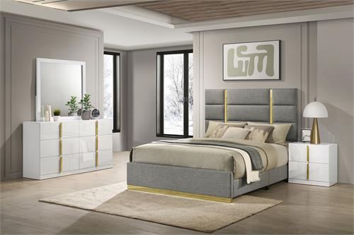 The Ines contemporary bedroom set by Coaster, channels high-end Italian style through sleek geometry and luxe material finishes. Each piece is accented with polished gold details that bring sculptural contrast to clean, modern lines. Case goods are wrapped in eco-friendly PET thermoplastic for a glossy, durable, and easy-to-clean surface, while the bed features soft woven upholstery with bold gold acrylic trim. A refined blend of form, function, and everyday resilience.