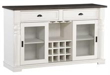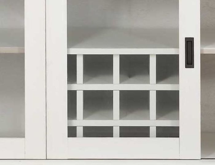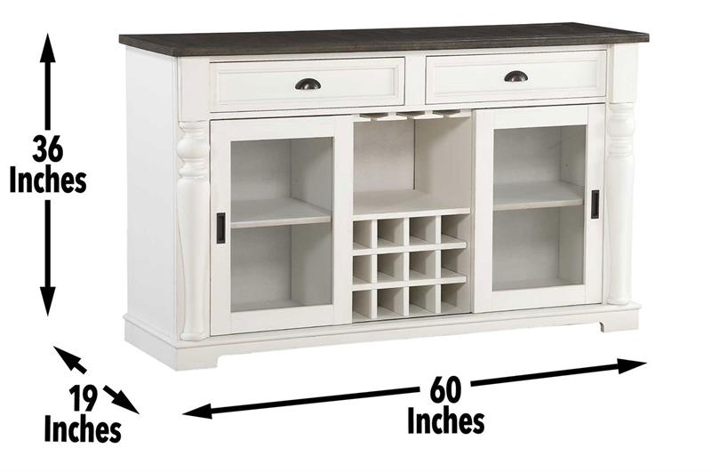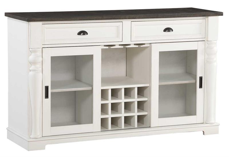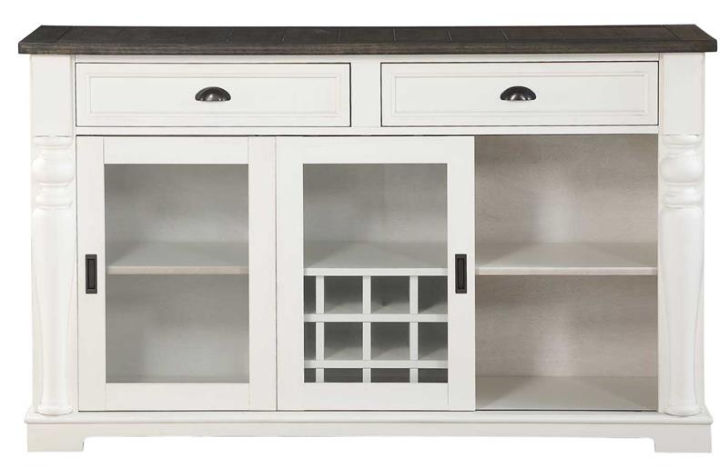 Joanna presents a classic farmhouse Server updated for today’s dining. Turned pilasters combine with cup pulls to create a look that feels both new and vintage. The Server has a two-tone ivory and mocha and features sliding glass doors that are great for display of collectibles. A middle wine rack with hanging stemware storage and three shelves add to the storage and convenience of the unit.