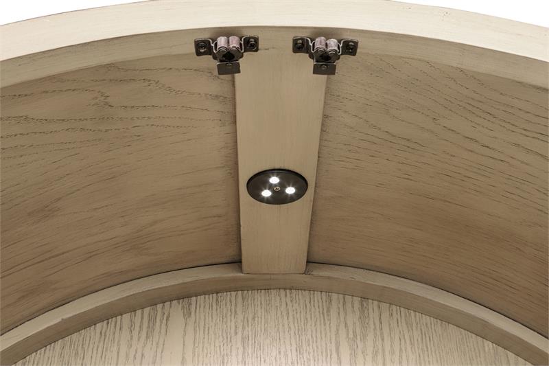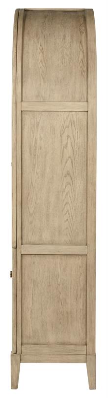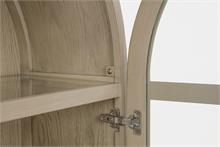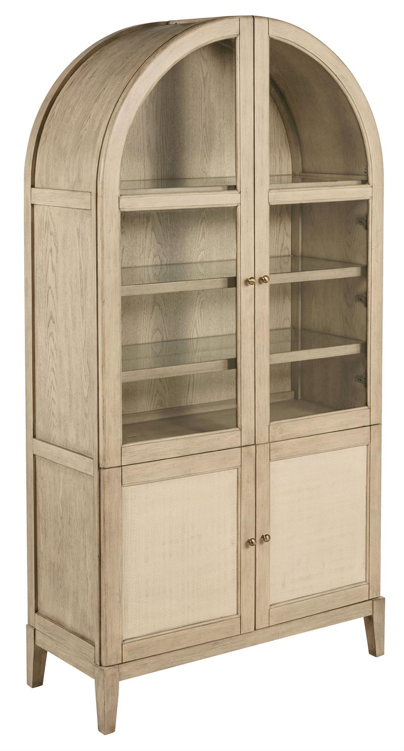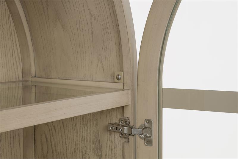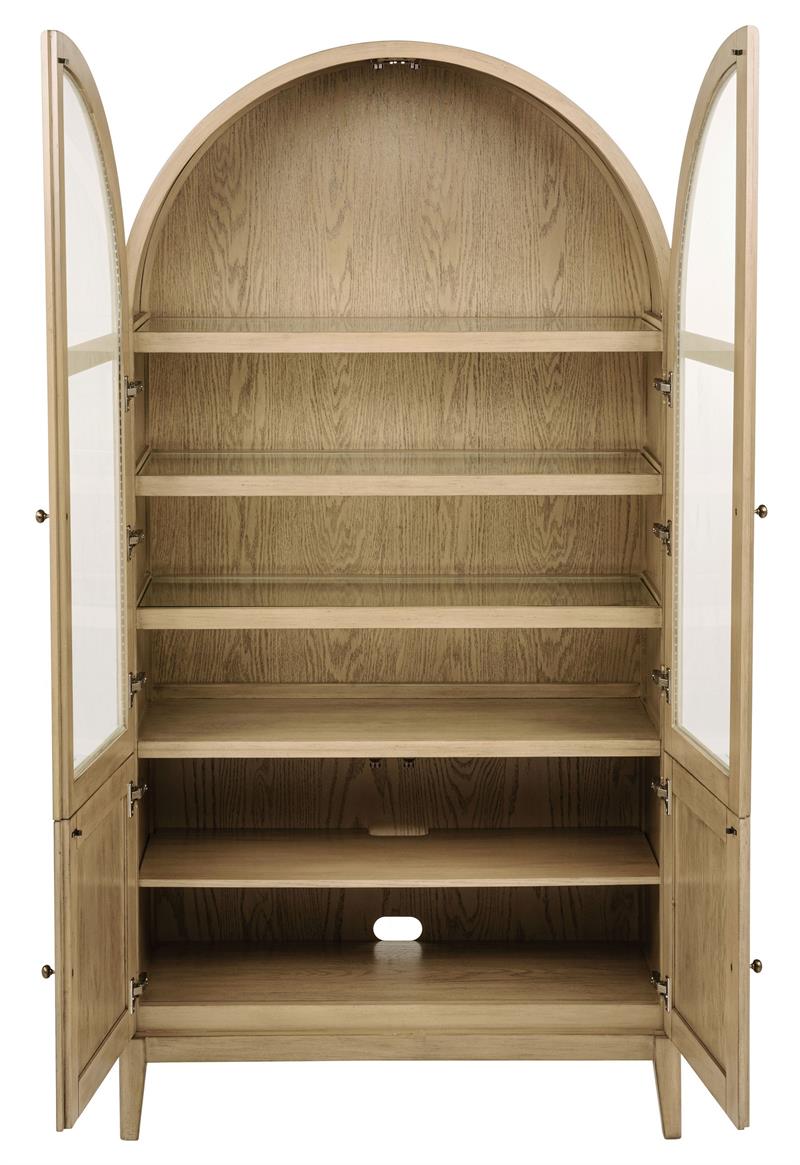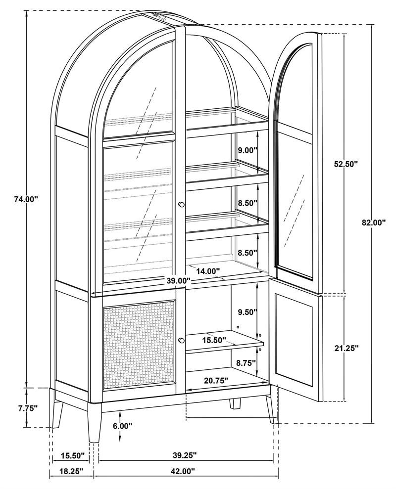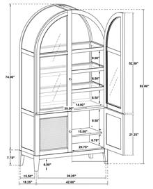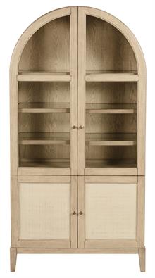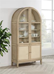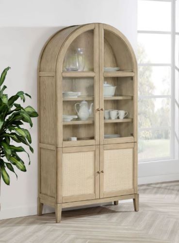 Elevate your space with the Kailani sophisticated vitrine cabinet by Coaster, designed to showcase your most treasured items with style. Featuring two wood-framed tempered glass doors, the upper section offers four tiers of shelving, perfect for displaying decor, dinnerware, or collectibles. The lower section of the cabinet provides additional storage with two hand-woven cane doors and a shelf inside for hidden organization. Crafted from solid wood, engineered wood, and oak veneer, this display cabinet offers both open display and concealed storage options. Its timeless arched design and natural wood finish make it a perfect addition to dining rooms, living spaces, or home offices.