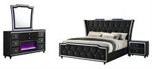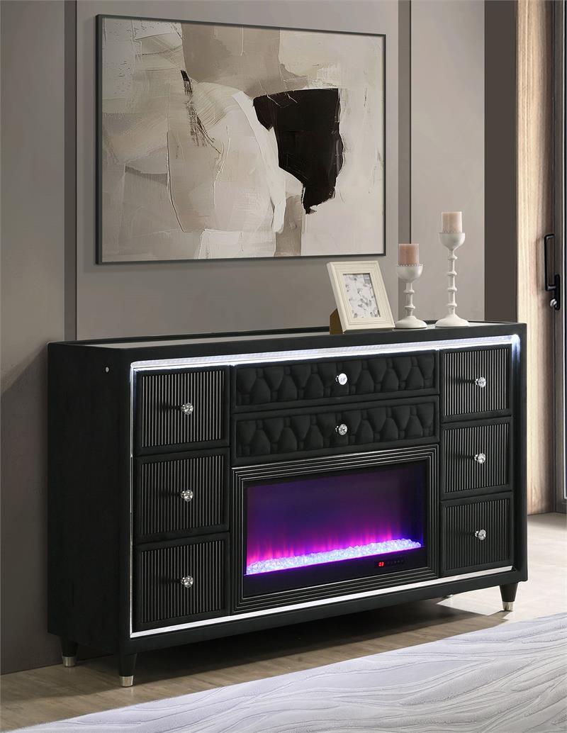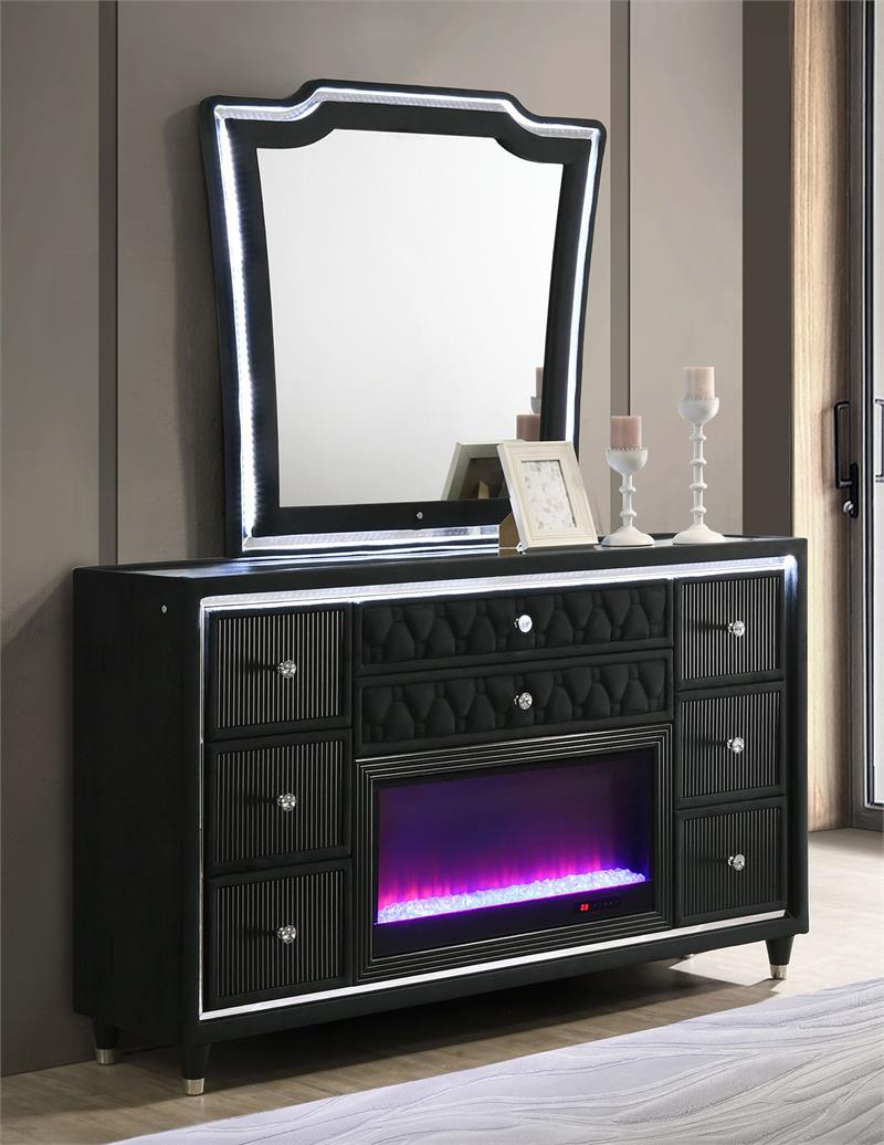 trimmed in LED lighting for a soft glow. The dresser features a built-in