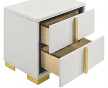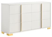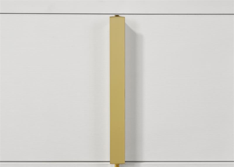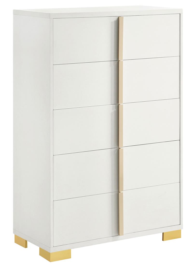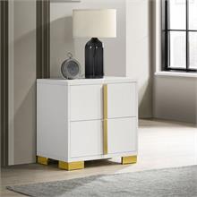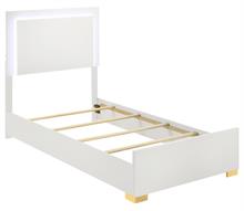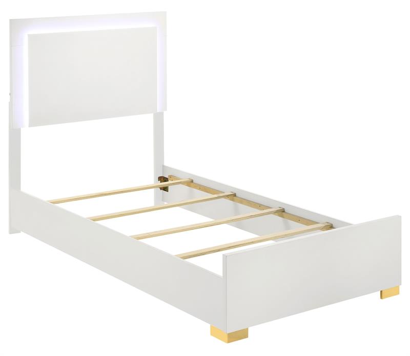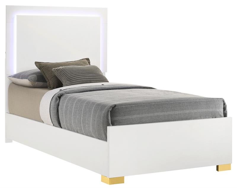 Cool white and warm gold create a compelling, modern ambiance for the stylish contemporary Marceline bedroom set by Coaster. Centered on clean-lined silhouettes, the set features a modern bed complete with a squared headboard with built-in LED lighting that creates the right mood for relaxing evenings. The light is operated with a touch switch on each side of the headboard, assuring it's in easy reach. Storage pieces add roomy drawers with vertical gold pulls, and the dresser is topped in a framed mirror that adds to the airy feel of this set. Bracket feet complete the set, offering reliable stability and just the right hint of modern glam sophistication.