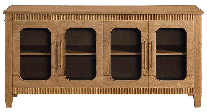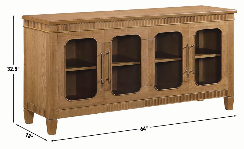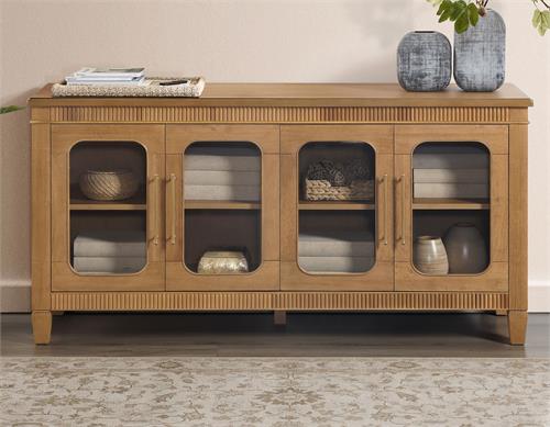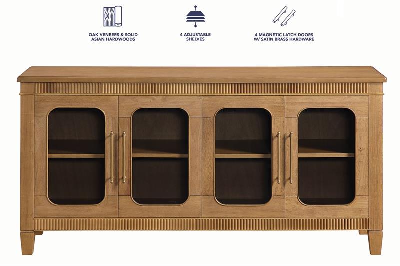 The Preston Butterscotch Server by Steve Silver, brings warmth, charm, and versatile functionality to any room. Its rich butterscotch finish highlights the classic dentil molding and rounded glass doors, creating a welcoming, stylish presence. Four adjustable shelves provide customizable storage within four spacious cubbies, while magnetic latch doors ensure secure, reliable closure. Perfect as a dining server, entertainment console, hallway accent, or sofa table, Preston offers beautiful display options, practical organization, and a timeless design that enhances both traditional and contemporary interiors with effortless appeal.