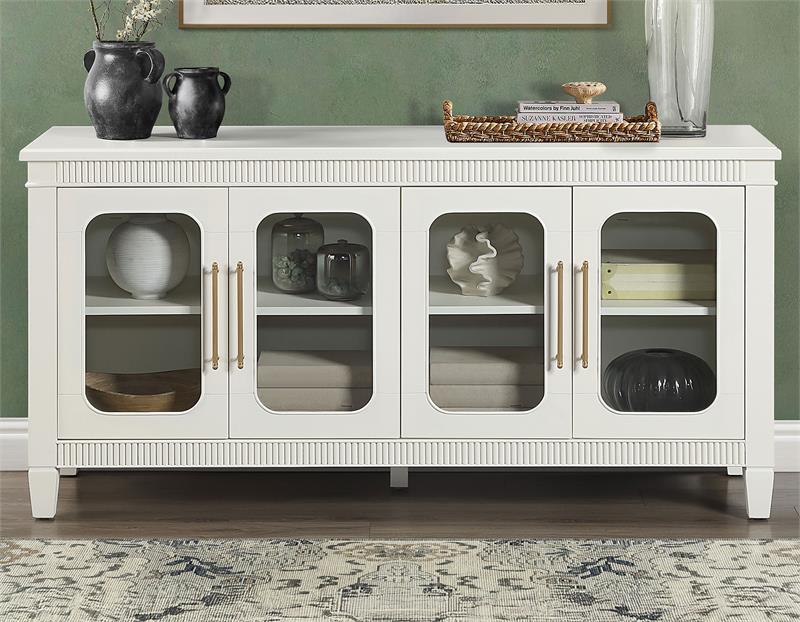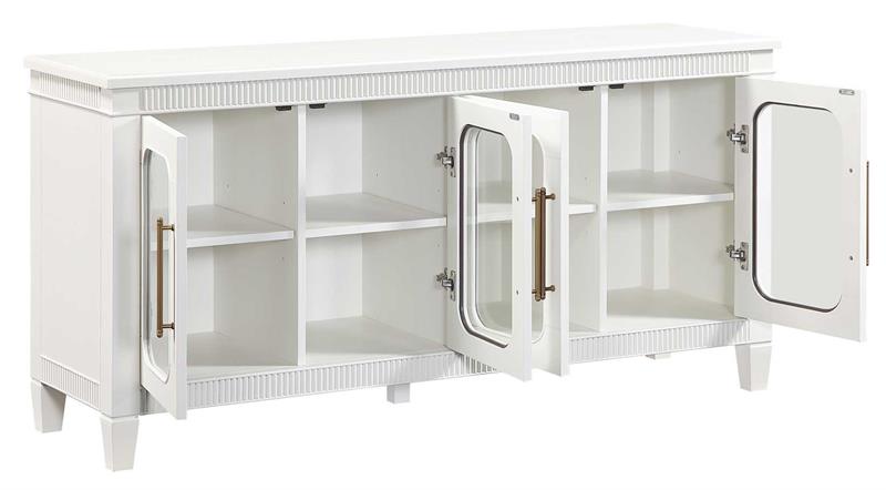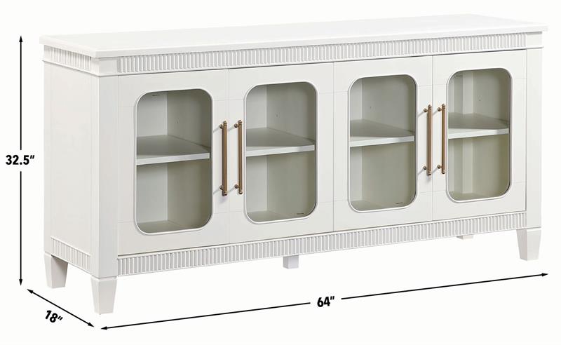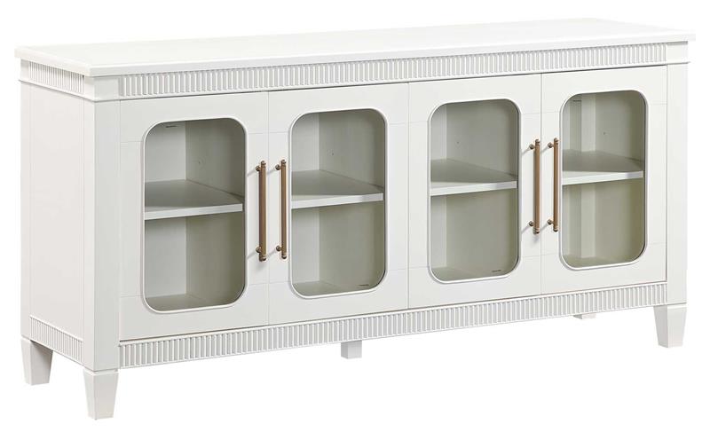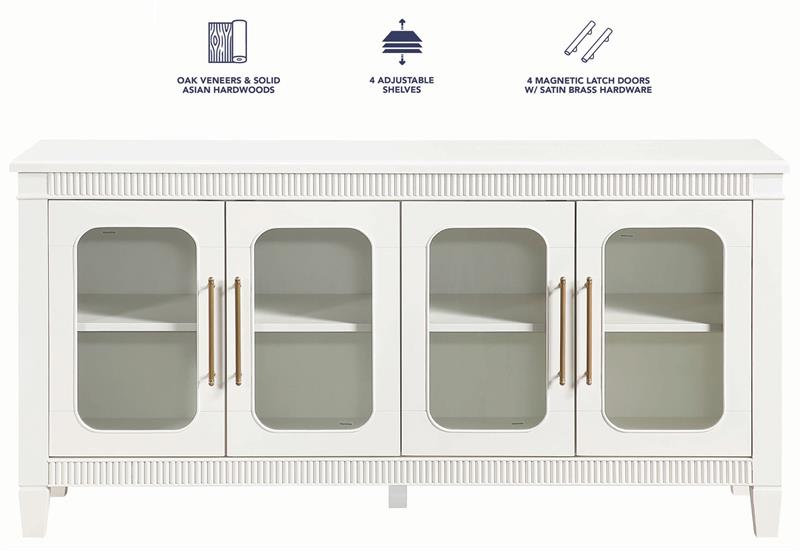 The Preston Ivory Server by Steve Silver, blends timeless design with modern functionality, making it a versatile accent for any room. Its soft ivory finish enhances the classic dentil molding and rounded glass doors, creating a bright, elegant presence. Four adjustable shelves offer customizable storage across four spacious cubbies, while magnetic latch doors ensure secure, reliable closure. Ideal as a dining server, entertainment console, hallway accent, or sofa table, Preston delivers stylish display space, practical organization, and a clean, sophisticated look that complements any décor.