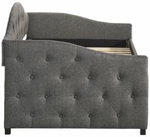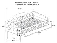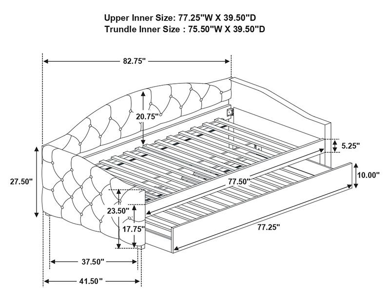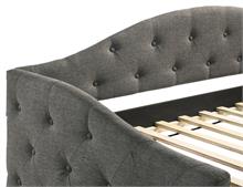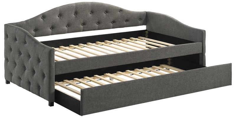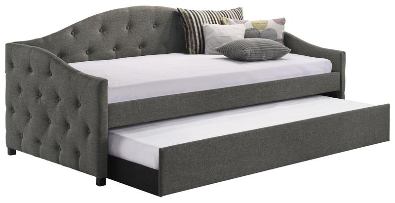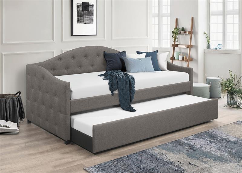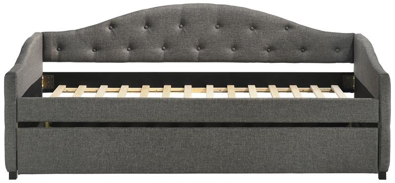 Sweeping lines and timeless details come together in the Sadie transitional twin daybed and trundle set. Wrapped in a soft fabric that coordinates with all sorts of color palettes, this daybed and trundle combo lends traditional elements such as a button-tufted back and sides. Thin sloped sides and a camelback offer a graceful design and feminine charm to compact rooms where additional sleeping arrangements come in handy. Tucked beneath the main frame is a hidden trundle set, easily retrievable and concealed by a smooth padded panel. Black legs elevate the trundle bed ever so slightly, allowing finished floors and colorful rugs to shine through. Slat kits are included.