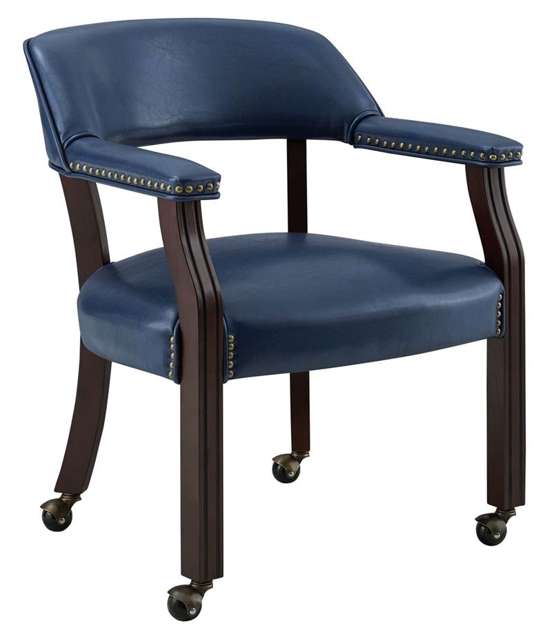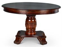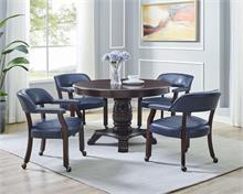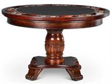 The Steve Silver Tournament Gaming Table Set has an attractive Cherry finish that will make a lovely addition to your home bar, billiards room or game room. Features include highly detailed woodworking and intricate carvings. Each of the matching chairs features detailed craftsmanship, casters which provide mobility, comfortable padded seats and backs that have decorative nail head trim and are upholstered in a durable faux leather that is easily cleaned. The tournament game table top includes poker chip and drink holders with an upholstered top for playing the ultimate games.