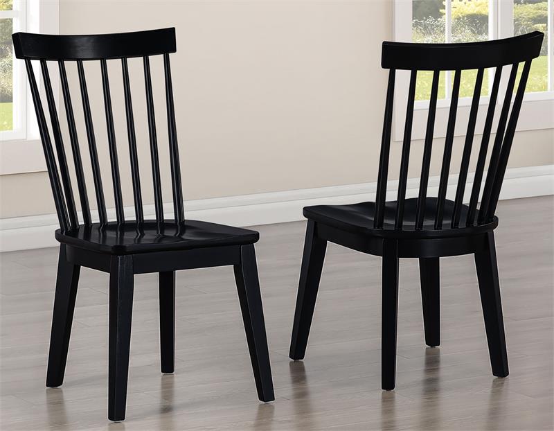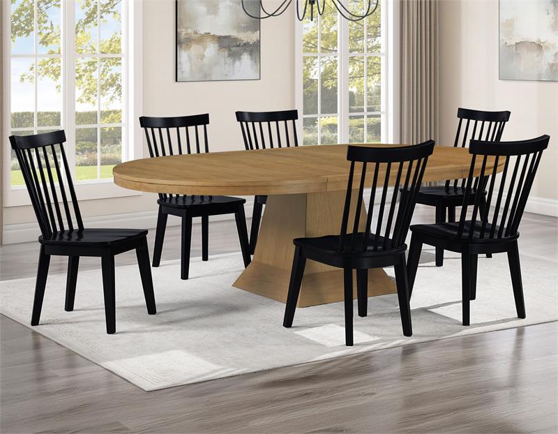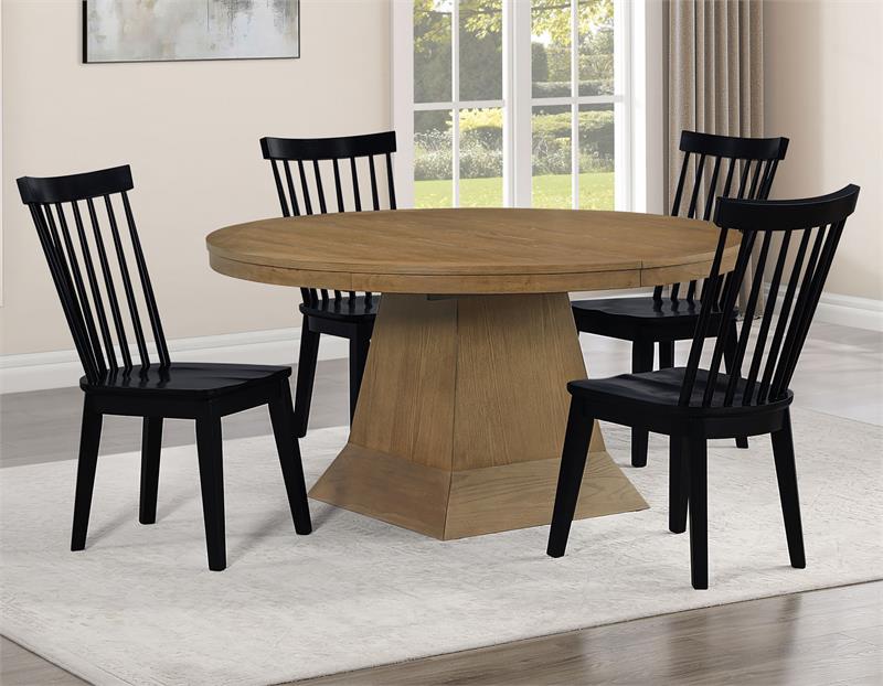 The Vaughn 5-Piece Dining Set by Steve Silver, combines timeless craftsmanship with modern style for a dining experience that’s both elegant and inviting. The grand 60–96″ Dining Table, finished in warm Driftwood, features a bold pedestal base and smooth-gliding leaves that expand effortlessly to seat up to ten. Four Vaughn Black Modern Windsor Side Chairs add contrast and sophistication, with contoured seats, slender slats, and sturdy wood construction for lasting comfort. Together, they create a striking centerpiece for any dining space.