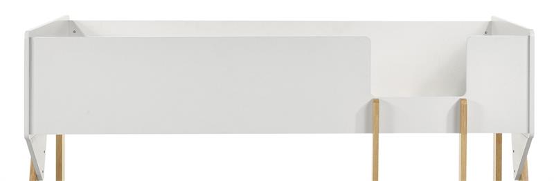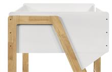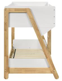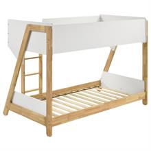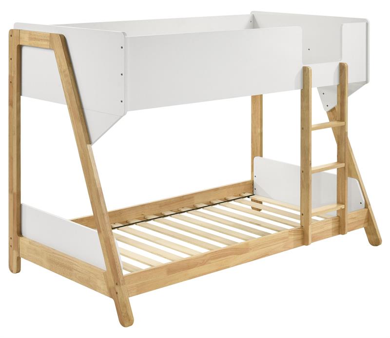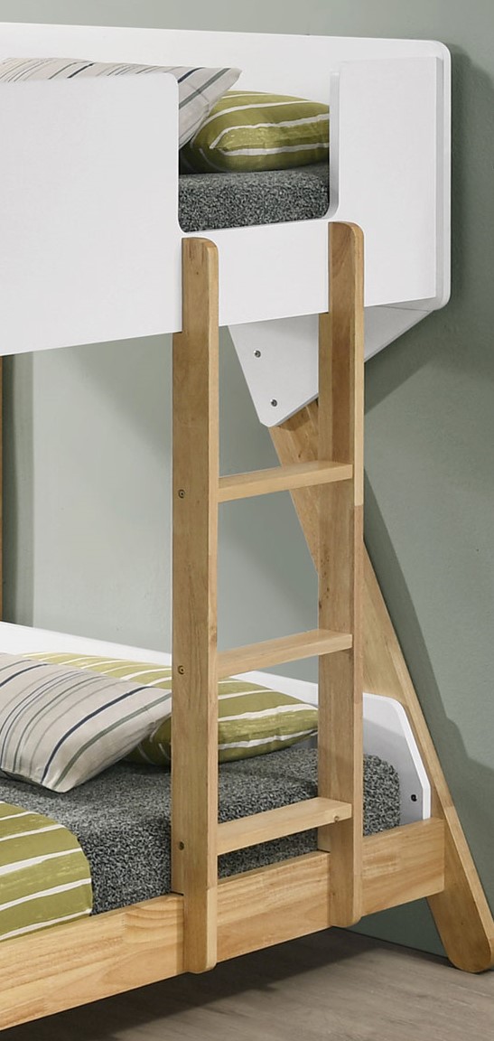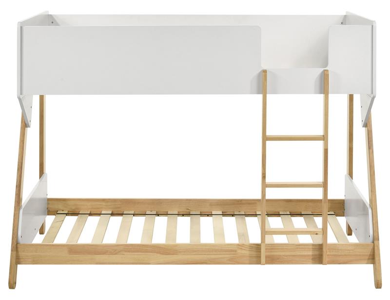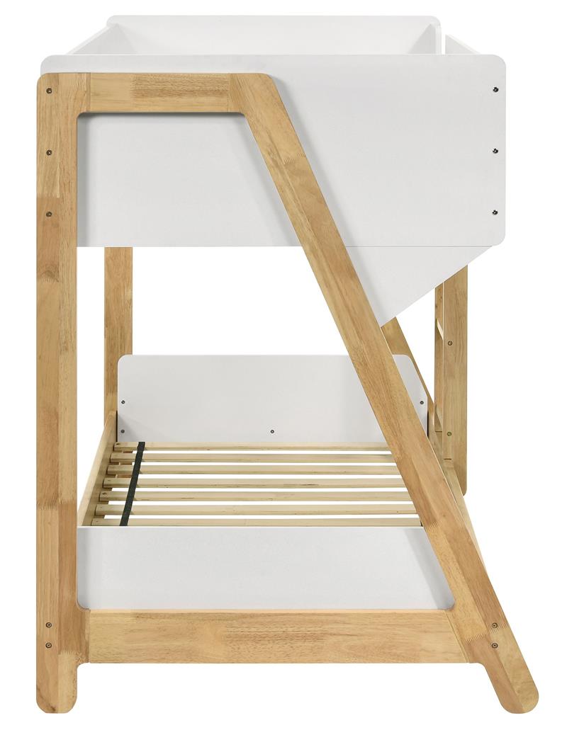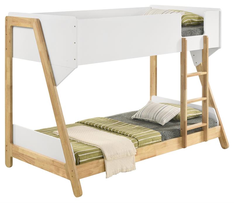 Stylish wood construction and a two-tone design highlight the modern Wyatt twin bunk bed set by Coaster. Perfect for a kid's bedroom, it offers two twin beds while saving floor space for playing. The bed features an angular frame and a natural wood finish, with white accents on the head and footboards and rails. An attached ladder provides access to the top bunk, which includes guard rails. It's a fantastic solution for siblings sharing a room or for sleepovers.